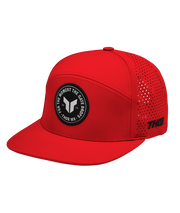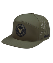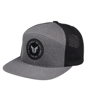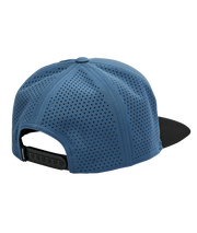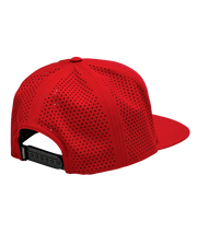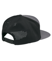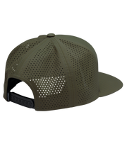 - Six-panel flatbill snapback with perforated back panels and woven patch.